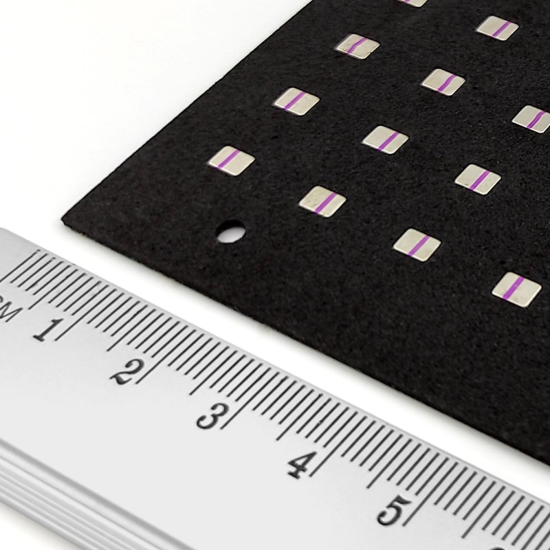 Výpredaj: Neodýmový magnet kváder 4×3×0,8 mm so samolepkou – N52 (stará samolepka, nelepí)