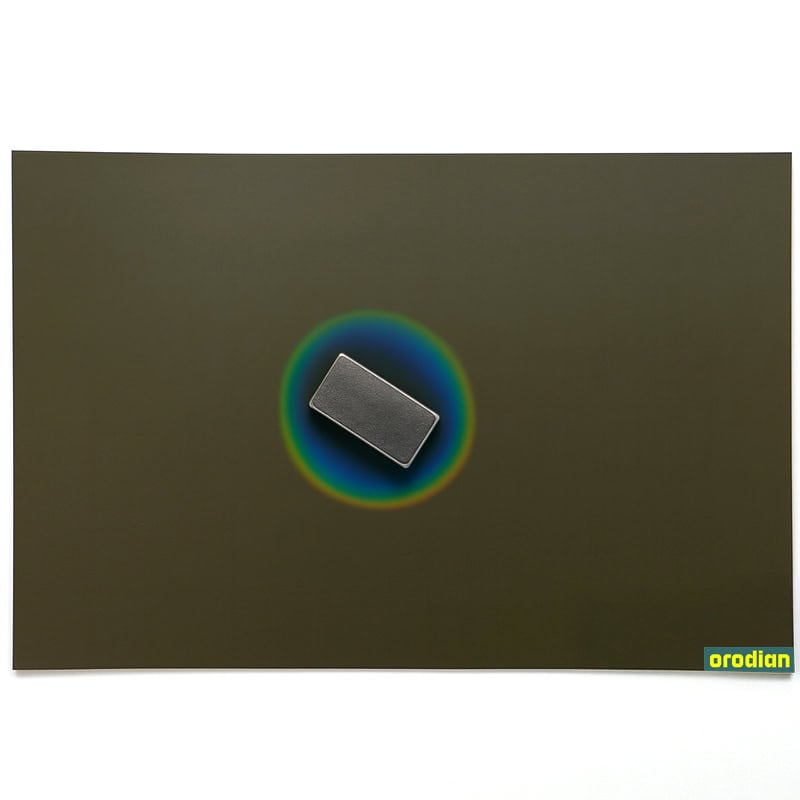 Obrázok vyššie ukazuje, ako špeciálna fólia po priložení magnetu okamžite stvárňuje jeho magnetické pole. Neviditeľné pole magnetu sa zobrazí v podobe farebných pruhov, ktoré pripomínajú dúhu.